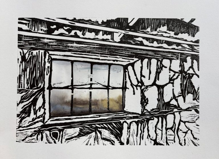 Een unieke print met houtsnede en aquarel, 30x40 cm.